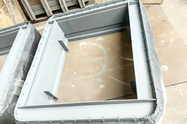 本文中所展示的圖片是我們翔盛環(huán)??萍脊窘谡跒樯綎|客戶生產(chǎn)制作的一批矩形非金屬補(bǔ)償器(矩形非金屬膨脹節(jié))。非金屬補(bǔ)償器通常由纖維織物蒙皮(硅膠為紅色、氟膠為黑色)與管道接口形狀相同的金屬框架、以及其它的結(jié)構(gòu)件所組成。